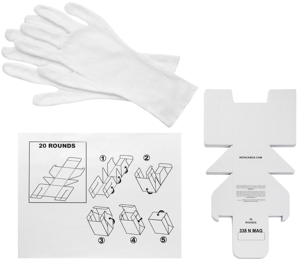 Made of .24 point, Acid-Free Card Stock using SAAMI Specs. You get a KIT of 30 fold-up ammo boxes, which are marked for the caliber inside. Included with each bundle are Blank Labels (Avery 5167), which can be printed with specific info such as bullet weight, primer, powder, and date of loading. ALSO INCLUDED… a pair of White Cotton Gloves to protect the ammo while it’s being placed in the box.