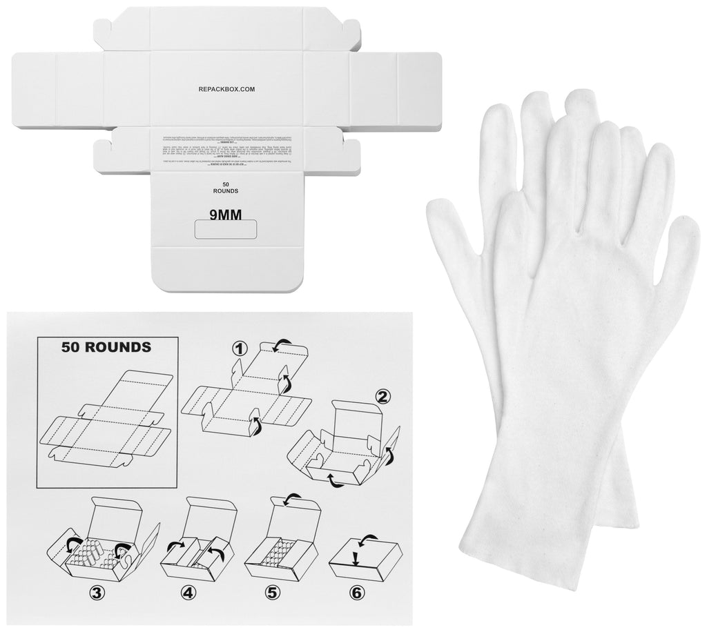 Also included with your order of a 30 BOX KIT or 100 BOX BUNDLE is a pair of White Cotton Gloves to keep the ammo fingerprint and oil free while it’s being packaged.