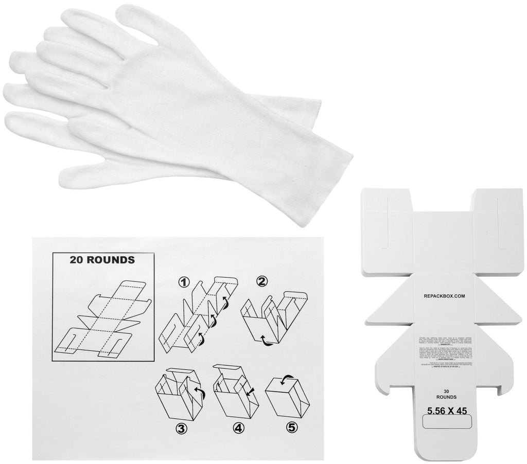 Also included with your order of a 30 BOX KIT or 100 BOX BUNDLE is a pair of White Cotton Gloves to keep the ammo fingerprint and oil free while it’s being packaged.